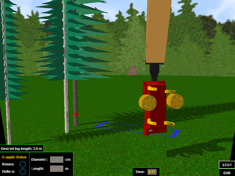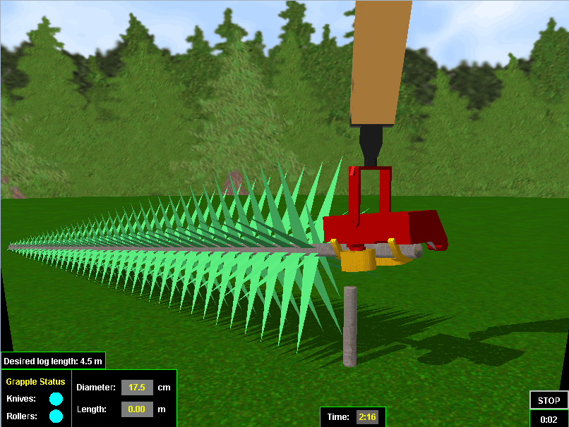 There are eight “Simulation Modules” of increasing difficulty, starting with controls familiarization. Later Simulation Modules feature directional felling, processing stems at the roadside, and finally selective thinning.