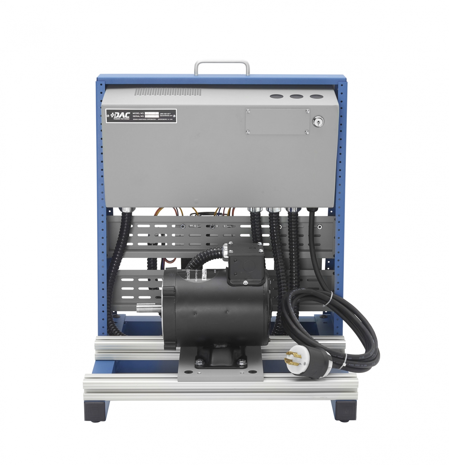 The training aid includes a welded aluminum base assembly, steel support structure and enclosure, aluminum motor mounting rails, and an applicable, industrial-duty, three-phase, squirrel-cage motor.