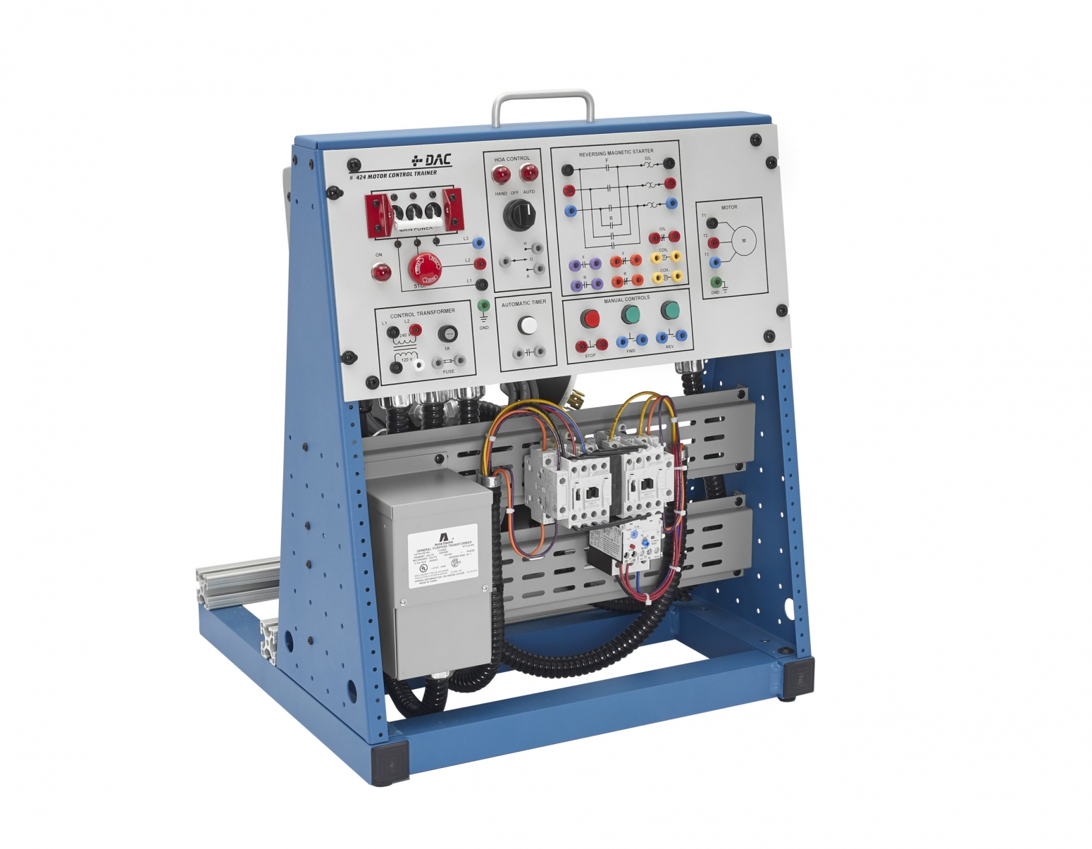 DAC Worldwide’s 3-Phase Motor Control Training System with Magnetic Starter, Low Voltage Start (424-000) is a motor control-related device for training in the operational principles, wiring, fault troubleshooting and application of industrial three-phase, reversing magnetic starters. The device is self-contained, allowing for individual study by a single student or a small student group. While often used independently, the training aid can be integrated with other products relating to PLCs, pilot devices, and motor-driven mechanical systems.