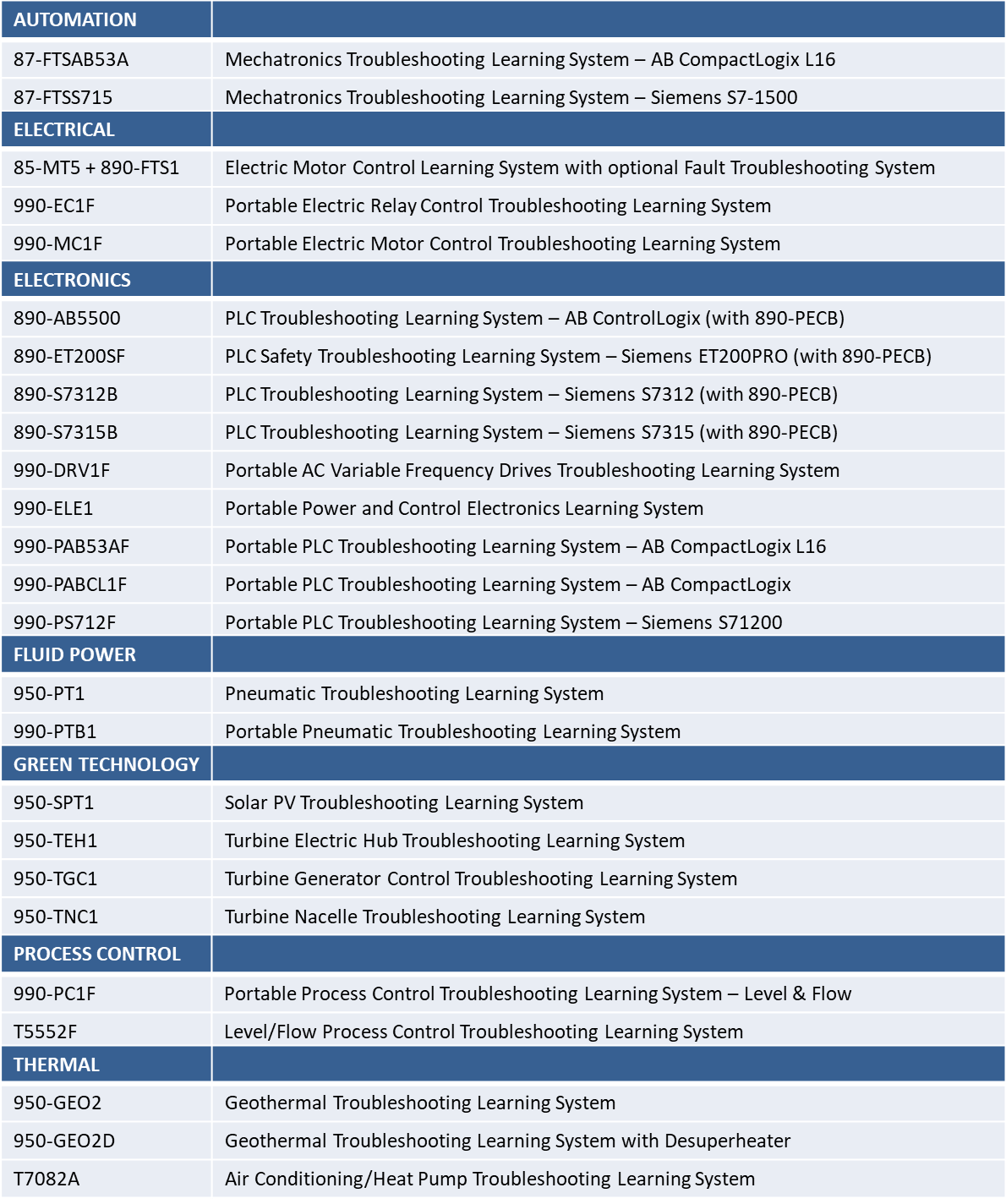 FaultPro comes standard with more than two dozen Amatrol training systems spanning seven different technologies: