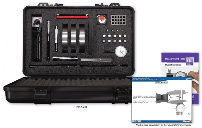 Just to name a few specific skills that learners will develop, the 990-MES1 teaches converting between U.S. customary units and SI metric units, measuring the outside dimension of a part using a micrometer, calibrating a dial caliper, mastering a dial indicator, and collecting and displaying data using data acquisition software.