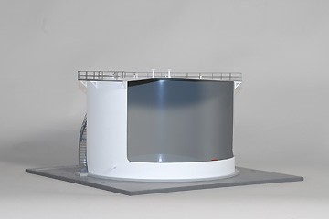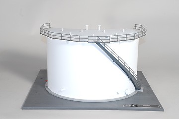 DAC Worldwide's Fixed Head Bulk Storage Tank Model (295-203) is a highly-detailed scale model of a common conical-roof, fixed-head storage tank as used in the storage of crude oil and other products within refineries, petrochemical plants, and other processing, production, and storage applications. This model reflects common designs and is a complete, to-scale replication. The primary shell includes a cutaway allowing for all internal features to be seen.