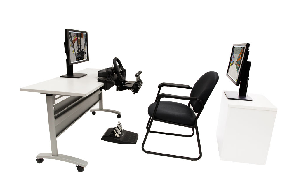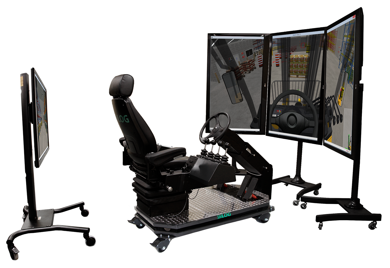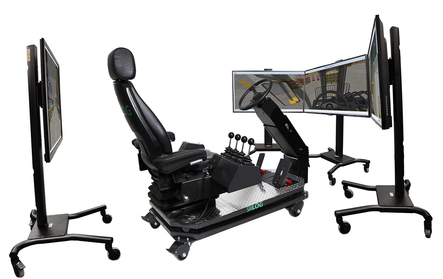 Simlog's new Operator Chair with industrial controls offers a superior simulation experience to train forklift operators thanks to an authentic operator seat with consoles for the left and right hands, and an adjustable steering column. All are mounted on an industrial platform with casters, for easy portability.