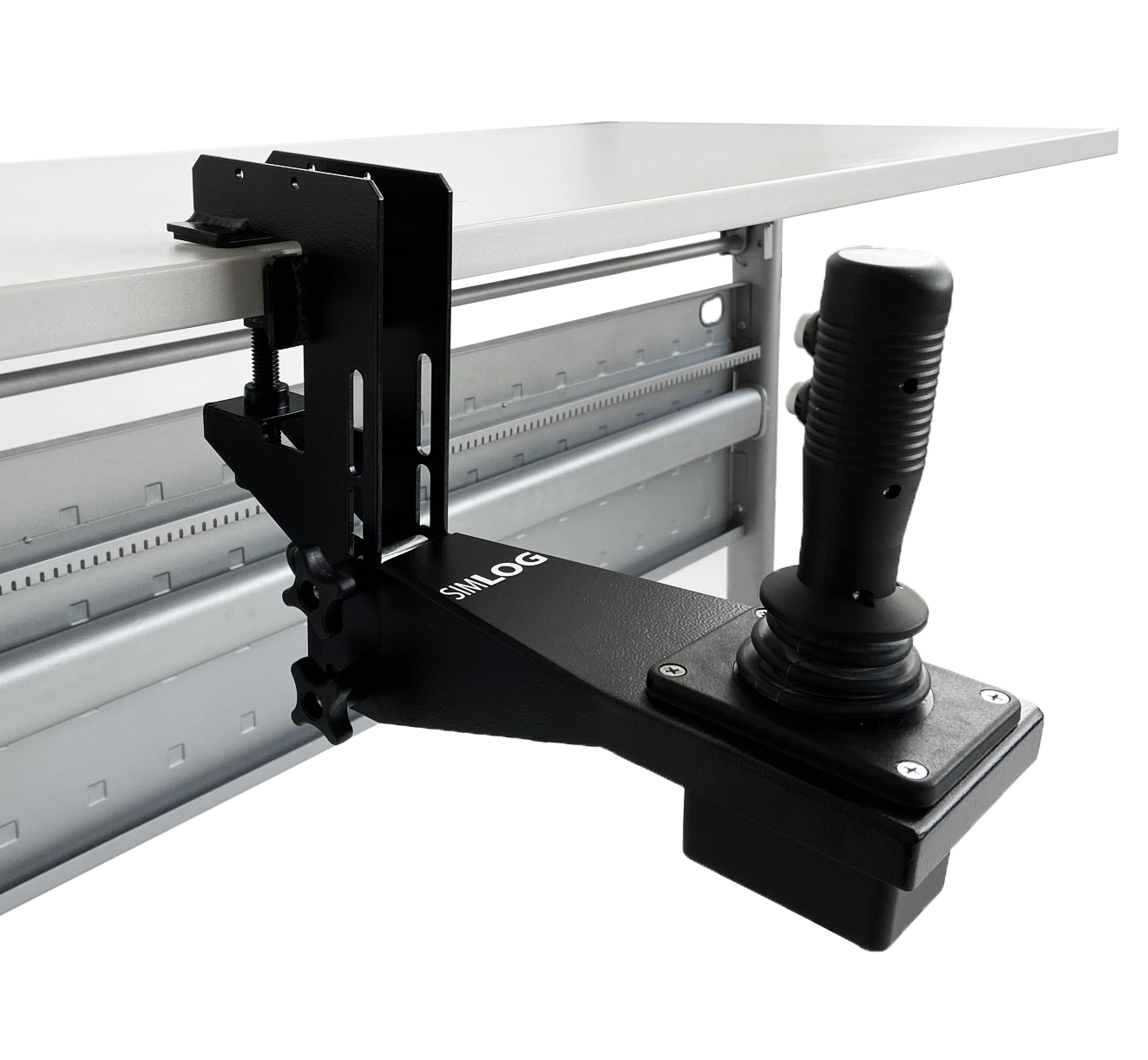 Since typical forklifts are equipped with three or four levers, you will need to use three or four USB-ready Forklift Levers. (The fourth lever controls the separation of the forks so if you use three levers instead of four, the simulation software will change the separation of the forks for you.) Simlog’s table-top mounting brackets will bring the joysticks down from table-top height to the sides of an ordinary chair, to better mimic the positioning of real controls in the cabin of real heavy equipment.