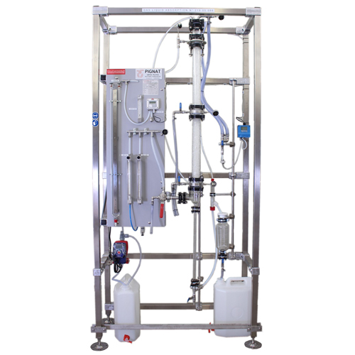 The trainer allows students to study the absorption of NH3 or CO2 in water, determine the material balance of the gaseous solute, influence of operational parameters on efficiency of the column, thermal balance, packing factor, and more. Educational handbook and technical manual included.