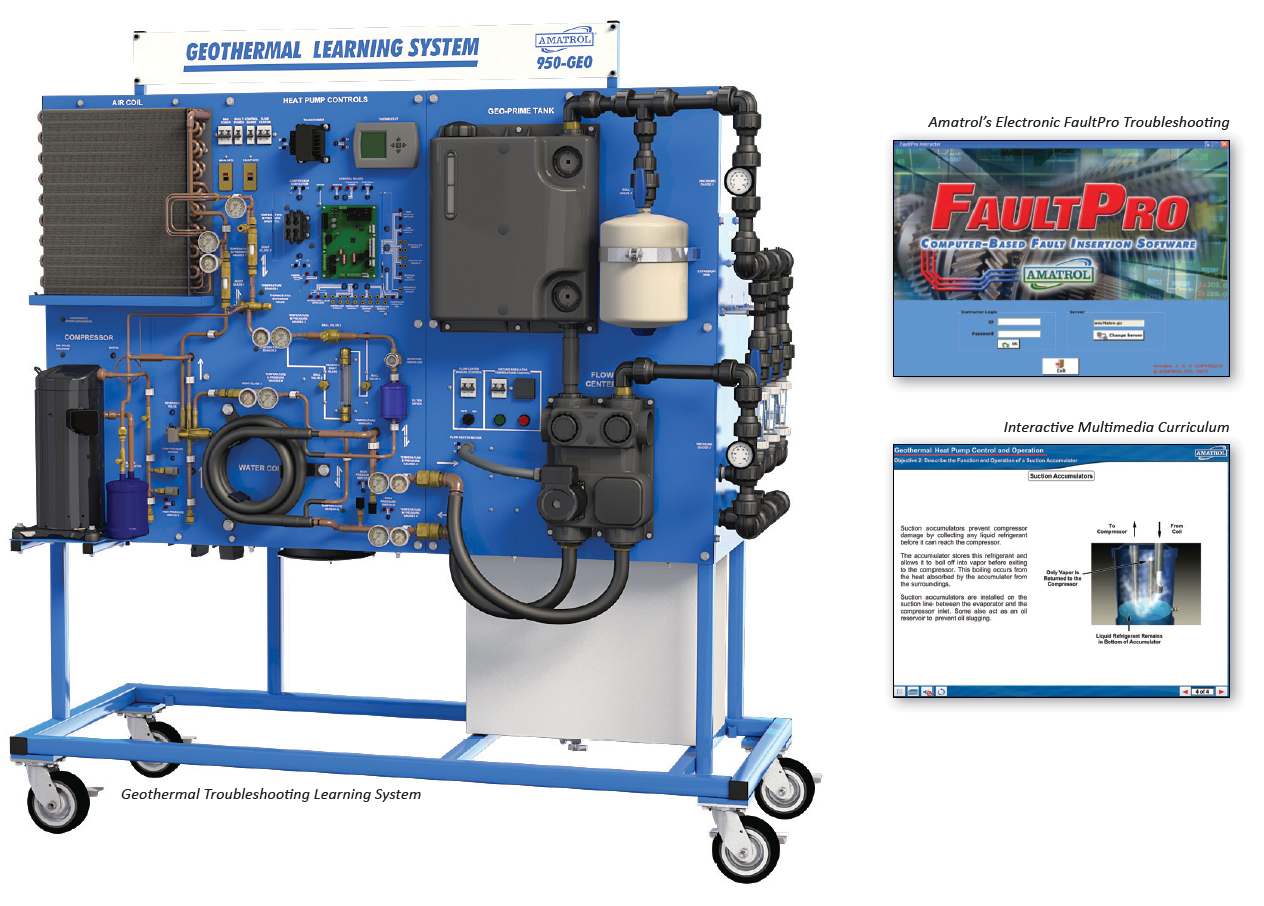 Amatrol’s 950-GEO2 Geothermal Troubleshooting Learning System is equipped with FaultPro, Amatrol’s premier electronic fault insertion program for teaching troubleshooting skills. Using FaultPro, learners troubleshoot electrical, mechanical, and fluid-based faults to become effective real-world experts on residential and commercial geothermal systems. In addition to troubleshooting, the interactive multimedia curriculum and hands-on skills will teach startup, operation, shutdown, and maintenance of a geothermal system.