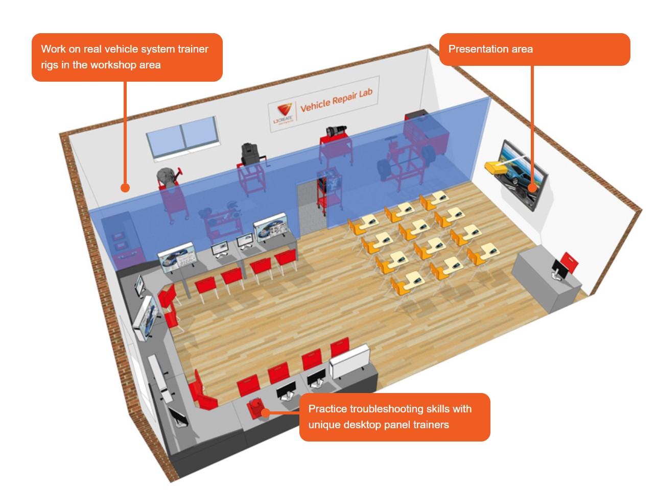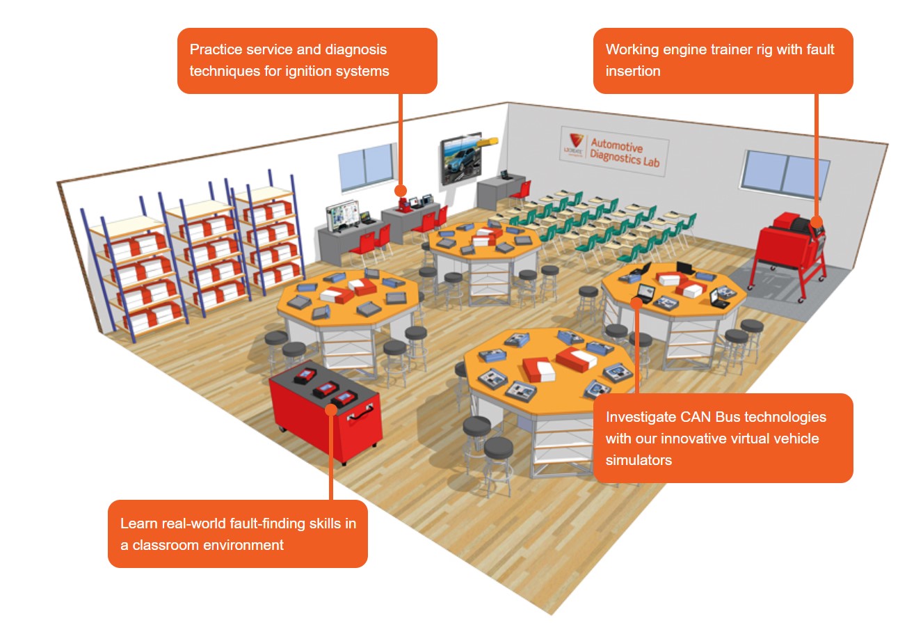 This laboratory is designed to limit the amount of text-based learning that future automotive technicians complete and replaces it with interactive experiences and skills practice across all the vehicle systems including engines, braking, steering and suspension, air conditioning and transmission systems.