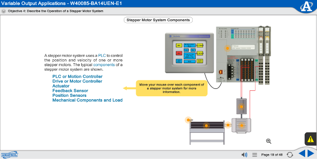 Amatrol's portable PLC troubleshooting training system features an interactive eLearning curriculum that integrates various types of learning methods to create an engaging, effective learning experience. Amatrol’s multimedia eLearning curriculum includes text with voiceovers, videos, 3D animations, pictures, and interactive activities, quizzes, and self-reviews. Specific PLC programming and troubleshooting topics covered include PLC programming; PLC motor control; event sequencing; PanelView Plus application editing; analog inputs and outputs; PLC systems troubleshooting; and analog I/O and applications troubleshooting. Within these topics, learners will study objectives like entering and running a basic routine using Studio 5000 software; designing a continuous-cycle reciprocating actuator PLC project to control a traverse axis; entering a PLC program to jog and home a stepper motor system; and troubleshooting a continuous cycle reciprocating motor PLC project.