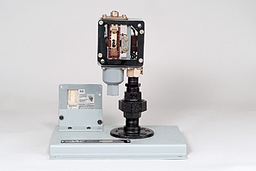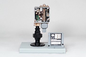 DAC Worldwide's Pressure Control Switch Sample Dissectible (272-980) is a realistic dissectible sample of a common industrial control-type pressure switch as used in automation and process systems. Due to the internal design characteristics of this industrial component, the full internal configuration and working mechanism are showcased using a clear acrylic replacement cover. A specialized base and stanchion mounting assembly positions the sample for convenient static viewing or for taking a closer inspection by hand after removal from the base assembly. A modular base assembly allows for convenient mounting on optional display, storage, and viewing products.