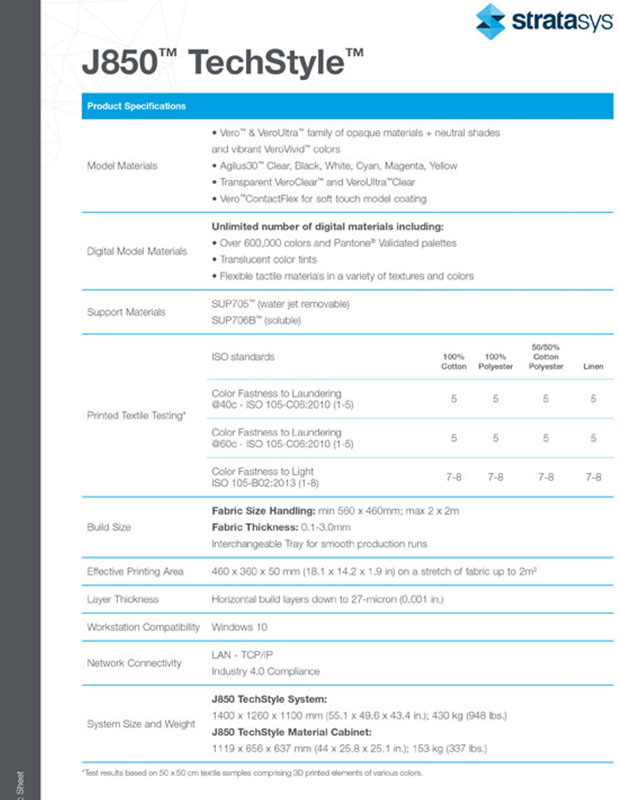 The J850™ TechStyle™ 3D printer is powered by 3DFashion™ technology. It provides full-color, multi-material capabilities for designs that can be printed directly to fabric, garments, footwear, and luxury accessories, delivering results that are not possible with traditional methods.