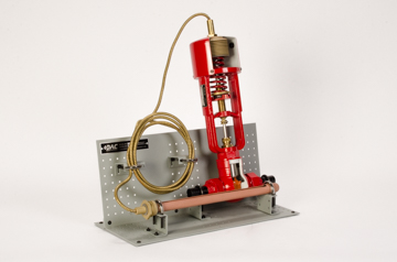 DAC Worldwide's Temperature Regulator Cutaway (295-701) is a sectioned temperature regulator allowing for convenient classroom or lab training in the design, operation, construction, and maintenance of this common control device used in oil and gas production. Sometimes referred to as a temperature regulating valve, these self-operating temperature regulators are commonly used in oilfield heater-treaters, separators, pre-heaters, and other types of heating equipment. A variety of carefully planned cut away areas combine to showcase the internal configuration of the device. The tank thermowell is also cut away allowing for view of the primary sensing bulb.
