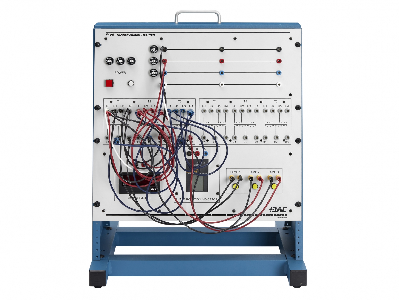 DAC Worldwide’s Transformer Wiring Training System (408-000) is a realistic training device that replicates the conditions and circumstances that an electrical worker encounters when making common power transformer connections in the field and industry. This self-contained, tabletop training system provides a safe, inexpensive, yet realistic alternative to paper-based learning without the danger of full-voltage field experience.