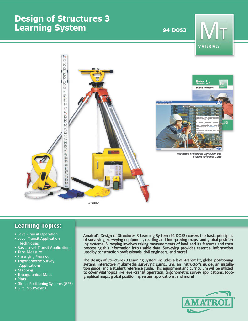 Amatrol's Design of Structures 3 (94-DOS3) covers the basic principles of surveying, surveying equipment, reading and interpreting maps, and global positioning systems. Surveying involves taking measurements of land and its features and then processing this information into usable data. Surveying provides essential information used by construction professionals, civil engineers and more!