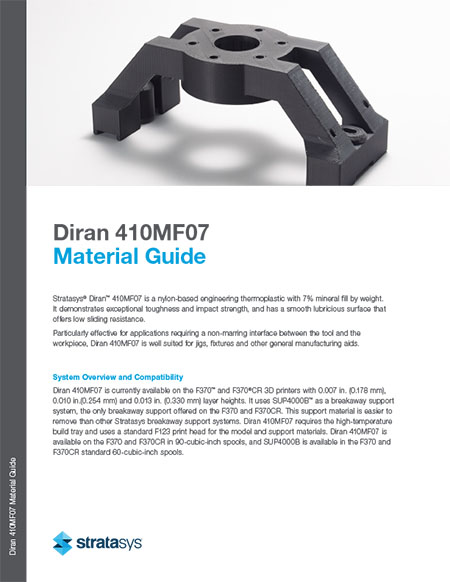 Diran 410MF07 is currently available on the F370™ and F370®CR 3D printers with 0.007 in. (0.178 mm), 0.010 in.(0.254 mm) and 0.013 in. (0.330 mm) layer heights. It uses SUP4000B™ as a breakaway support system, the only breakaway support offered on the F370 and F370CR. This support material is easier to remove than other Stratasys breakaway support systems. Diran 410MF07 requires the high-temperature build tray and uses a standard F123 print head for the model and support materials. Diran 410MF07 is available on the F370 and F370CR in 90-cubic-inch spools, and SUP4000B is available in the F370 and F370CR standard 60-cubic-inch spools.