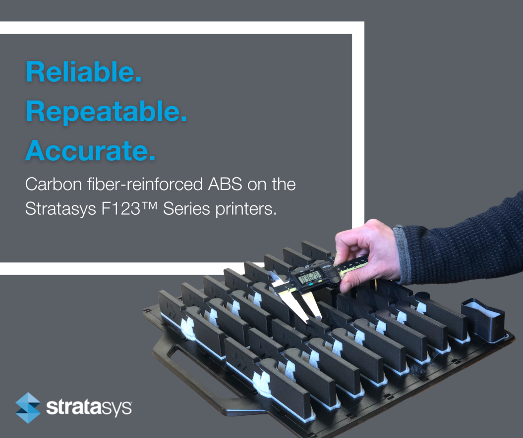 Stratasys ABS-CF10 combines the benefits of a carbon fiber filament with the desirable mechanical properties and ease of use of ABS 3D printing material. The result is an engineering thermoplastic with superior strength and rigidity for factory floor tooling applications.