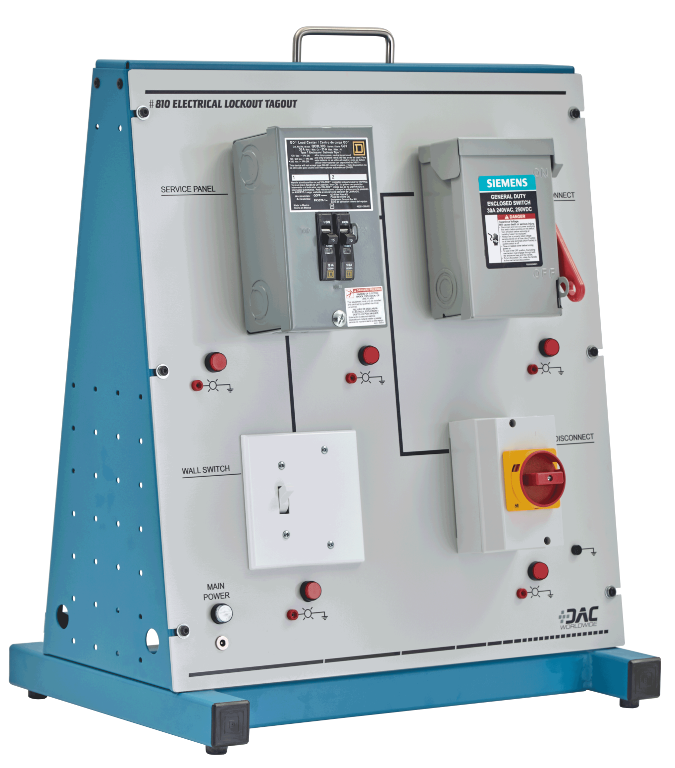 DAC Worldwide’s Electrical Lock-Out/Tag-Out Training System (810-000) provides a practical, hands-on approach to teaching these essential safety skills. This affordable, portable tabletop trainer is designed for use in industrial settings to teach the identification and lock-out of hazardous electrical energy sources, all while maintaining user safety with a reduced voltage of 24VDC.