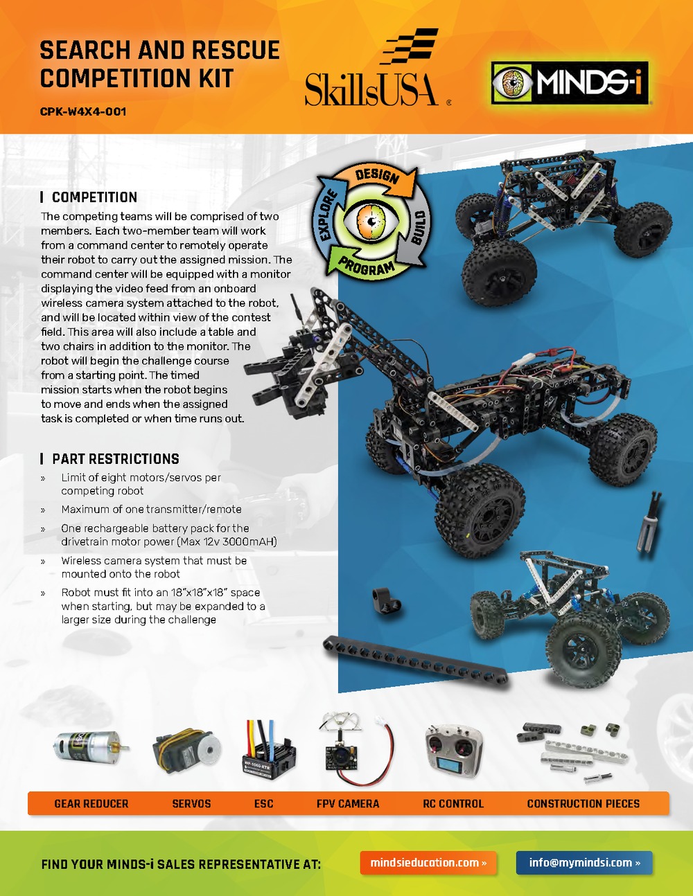 The Minds-i Search and Rescue Competition Kit was designed in collaboration with SkillsUSA to challenge students with a real-world robotics mission. This unique opportunity allows teams to design, build, program, and operate a remote-controlled robot through a timed rescue course.