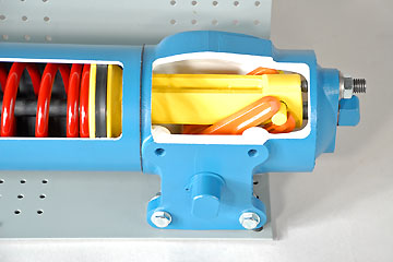 Through careful sectioning, the complete internal configuration of the actuator can be seen, while also allowing for disassembly for more complete inspection. All primary features have been retained, allowing for basic maintenance training. The conversion from linear pneumatic thrust to rotary output force can easily be seen.