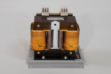 Through careful sectioning, the complete internal configuration of the transformer can be seen. Details shown include laminated steel core, primary and secondary windings, and primary insulation.